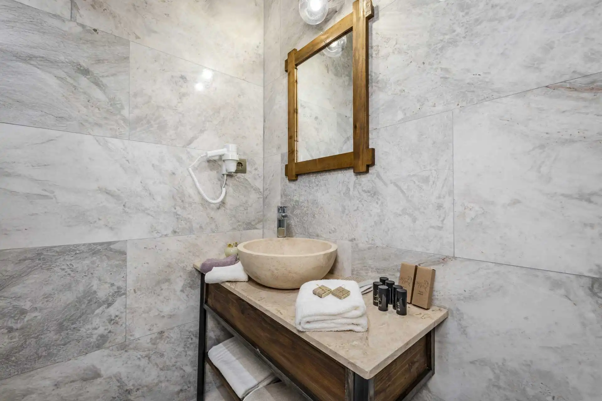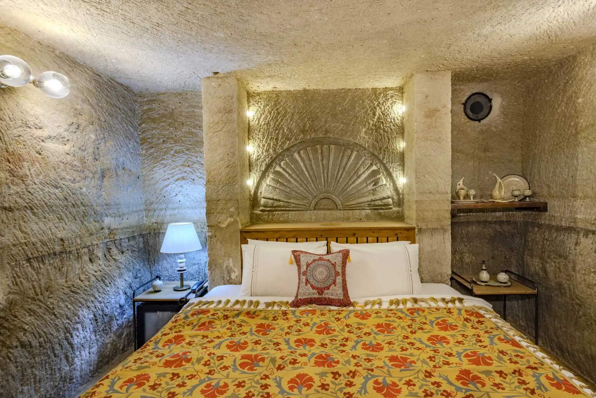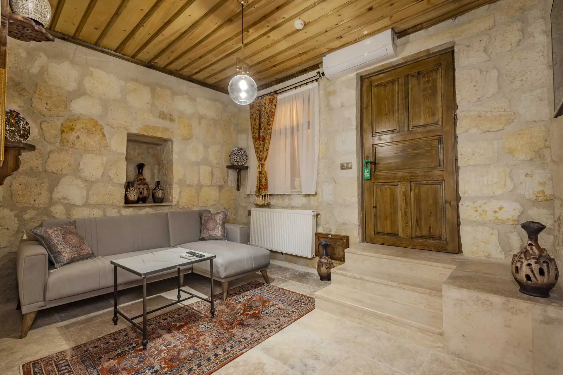 Welcome to room 103, our Deluxe Double King Cave, one of the most special accommodation units at the Sara Cave hotel. This authentic cave room is designed to offer you a unique experience by combining modern comfort with historical texture. As you relax on the spacious and comfortable double bed, you will feel the magic of Cappadocia in every corner of the room.