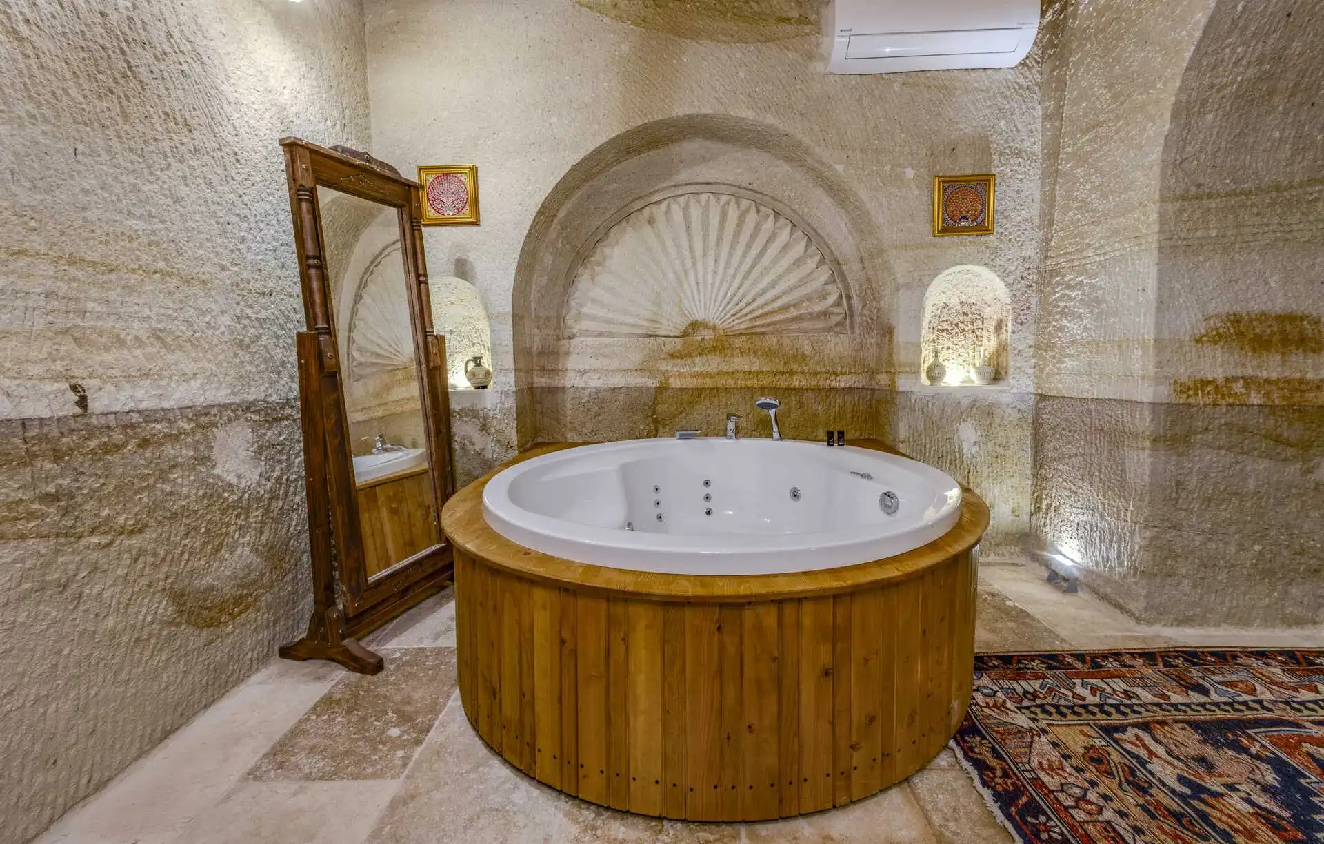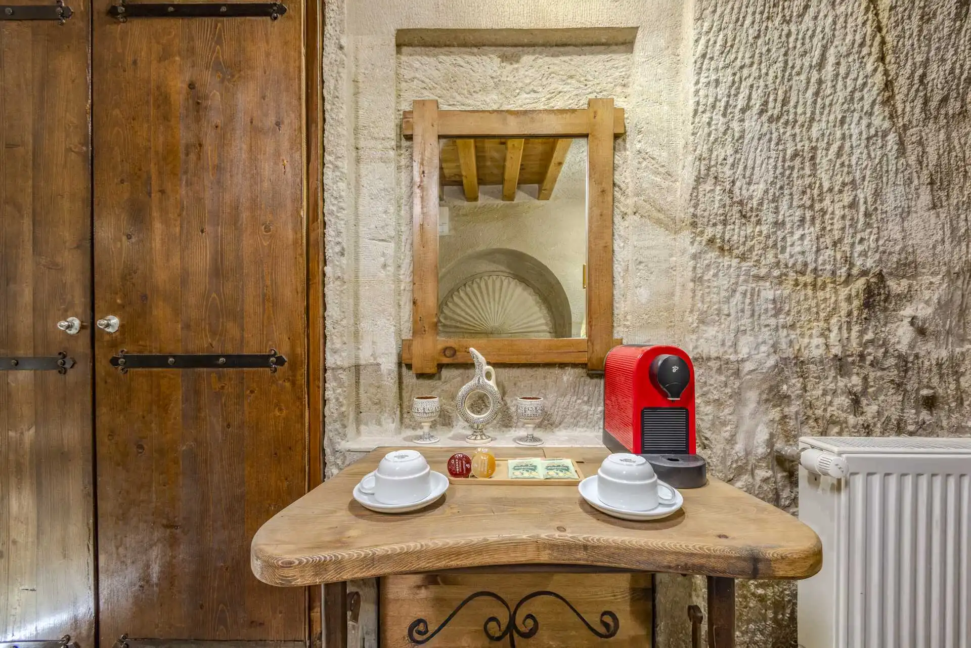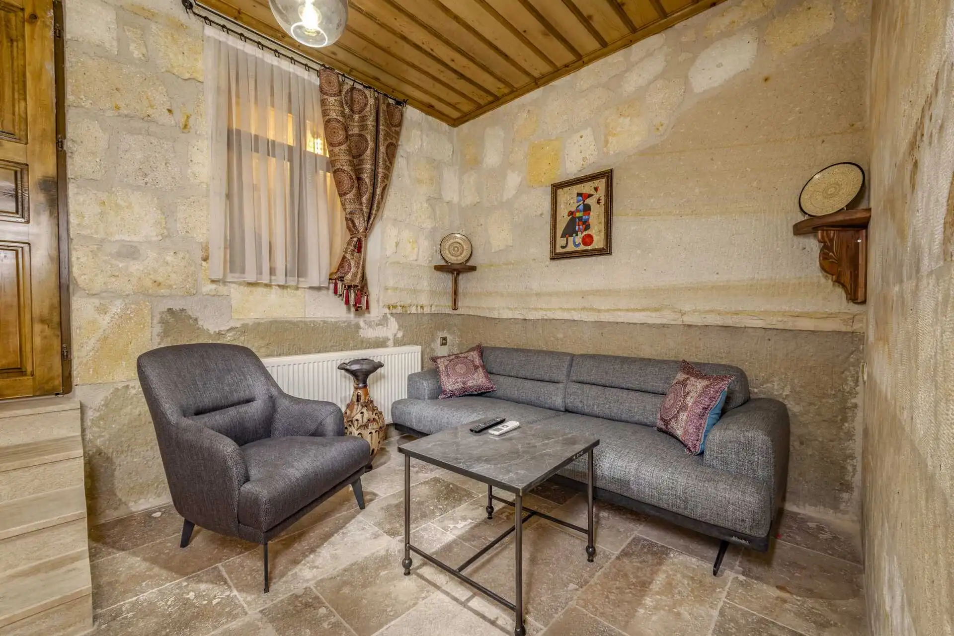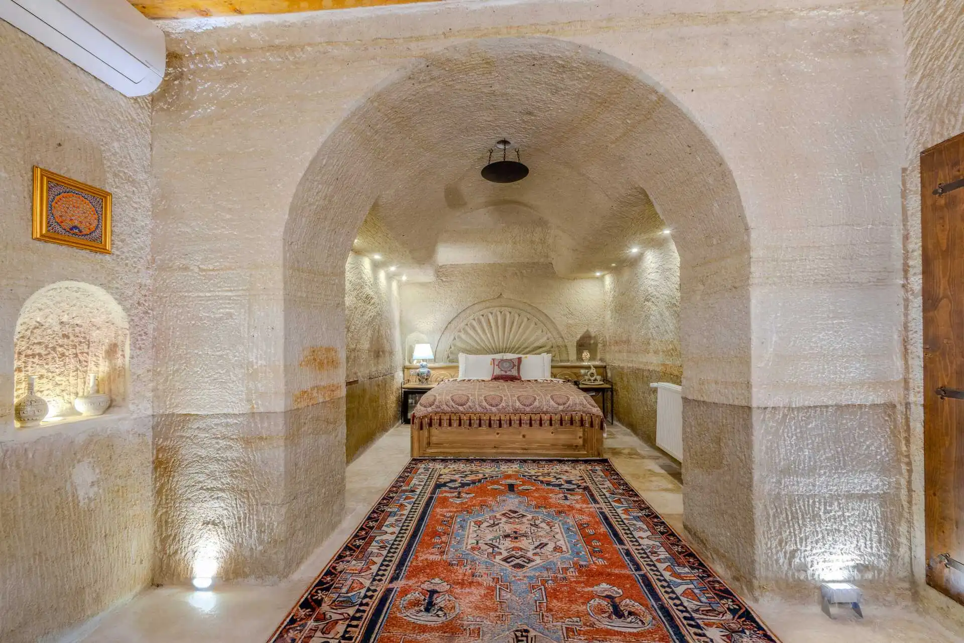 Welcome to room 104, our Deluxe Double King Cave, which elegantly reflects the authentic atmosphere of the Sara Cave hotel. In this special room where historical rock texture meets modern comfort, you can unwind on a spacious and comfortable double bed. Every detail of the room is meticulously designed to provide you with an unforgettable Cappadocia experience.