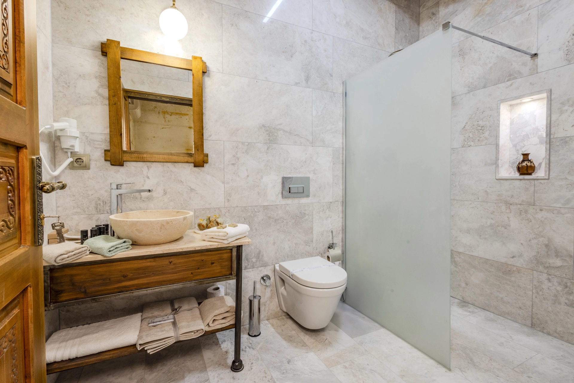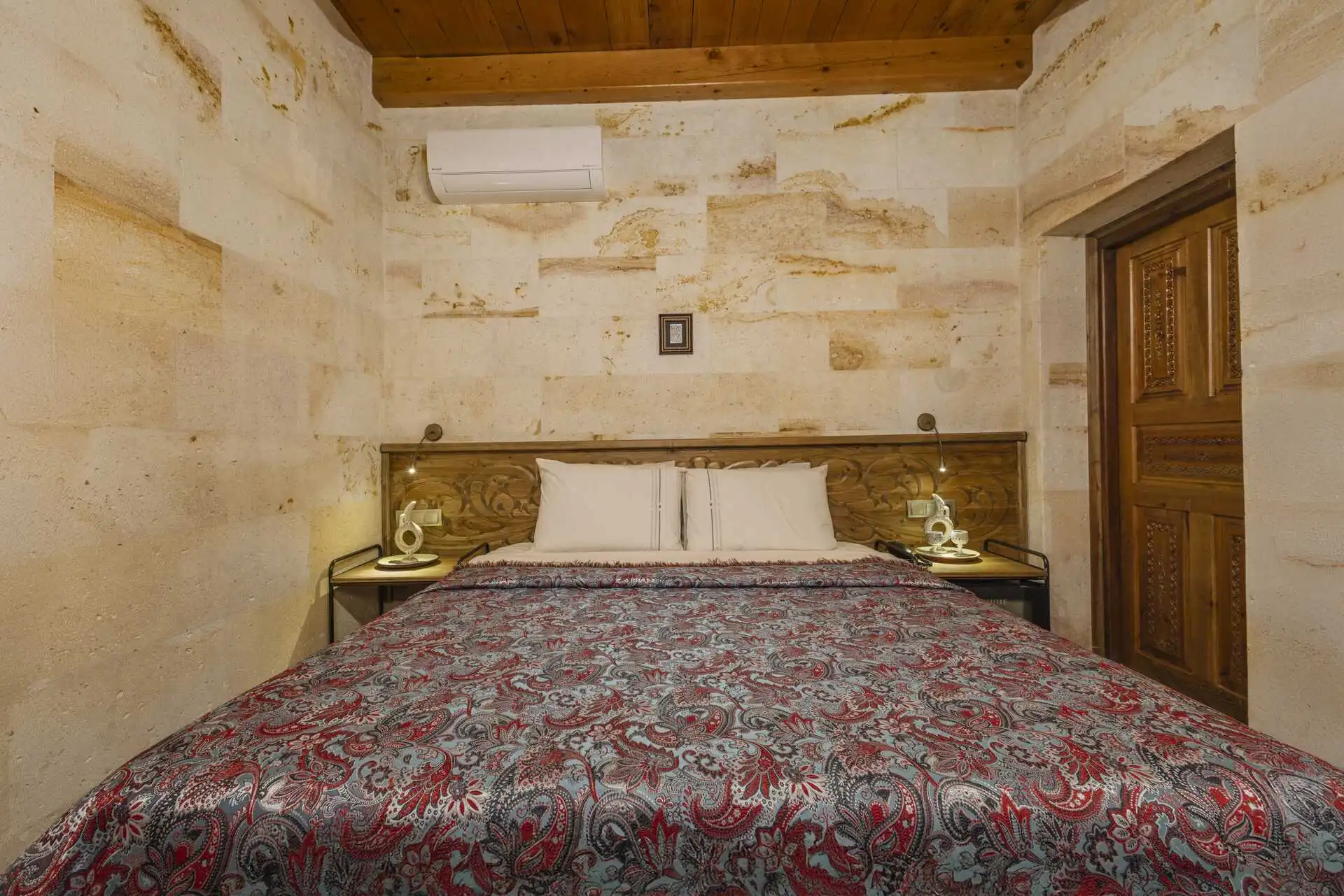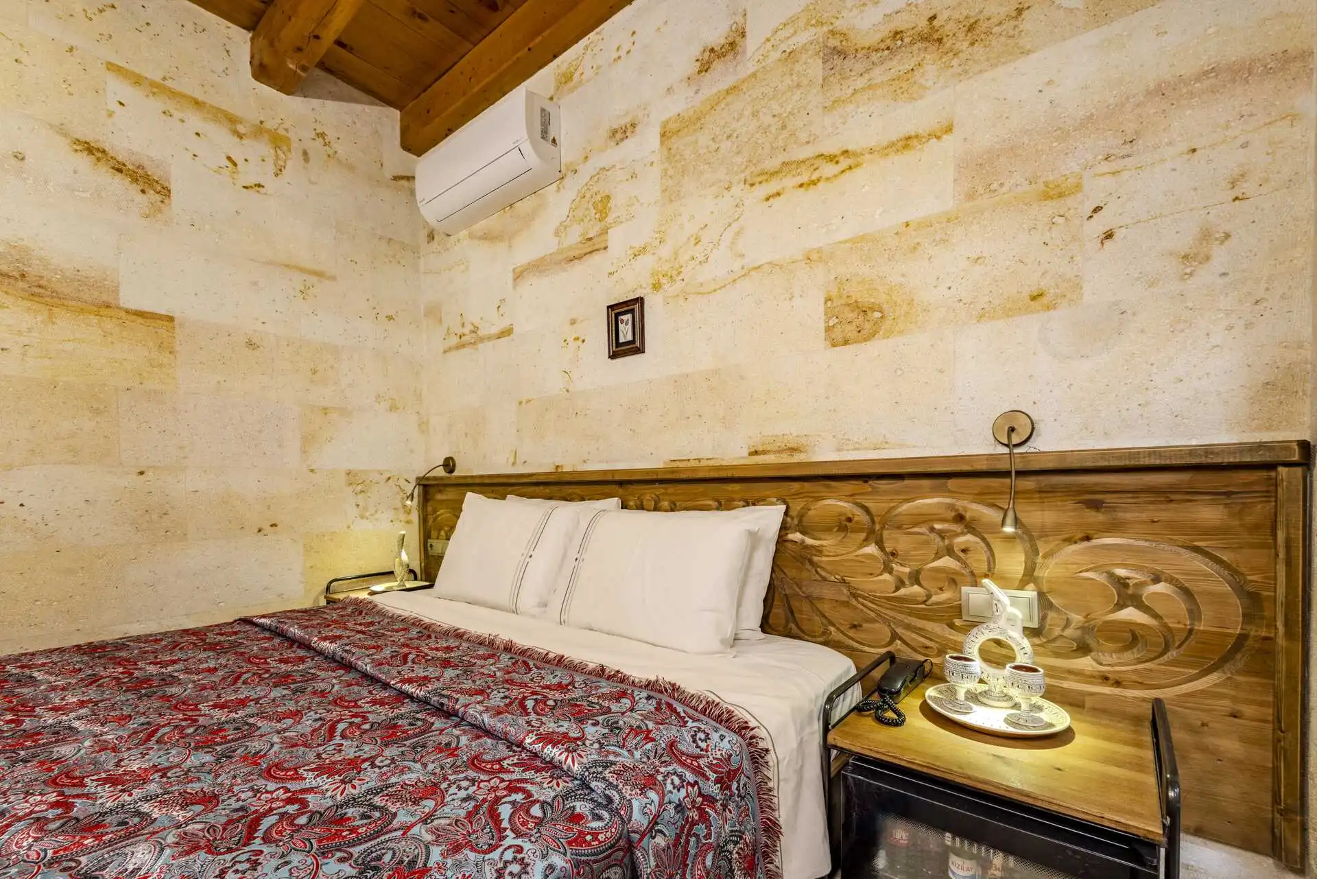 Welcome to room 108, our Deluxe Double Stone, one of the stylish and comfortable stone rooms at the Sara Cave hotel. This room, where traditional stonework meets a modern and simple design, is crafted to offer you both an authentic and a relaxing stay. You can unwind from your day on the spacious and comfortable double bed.