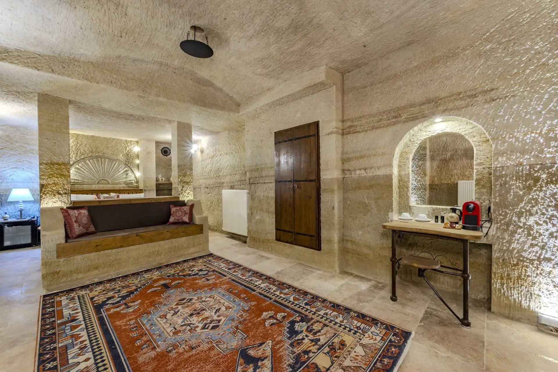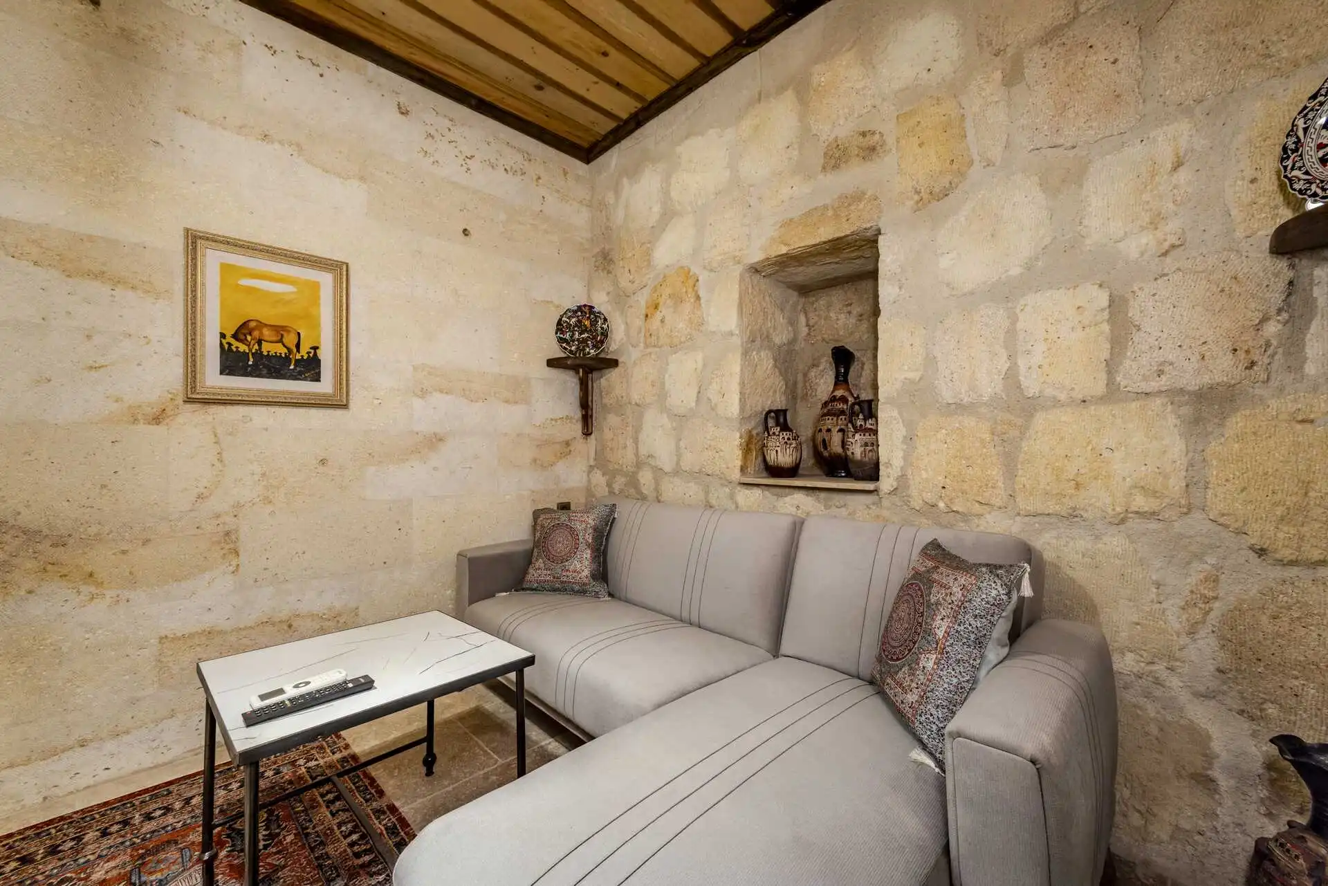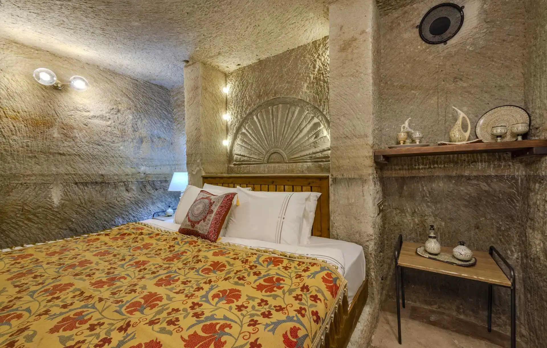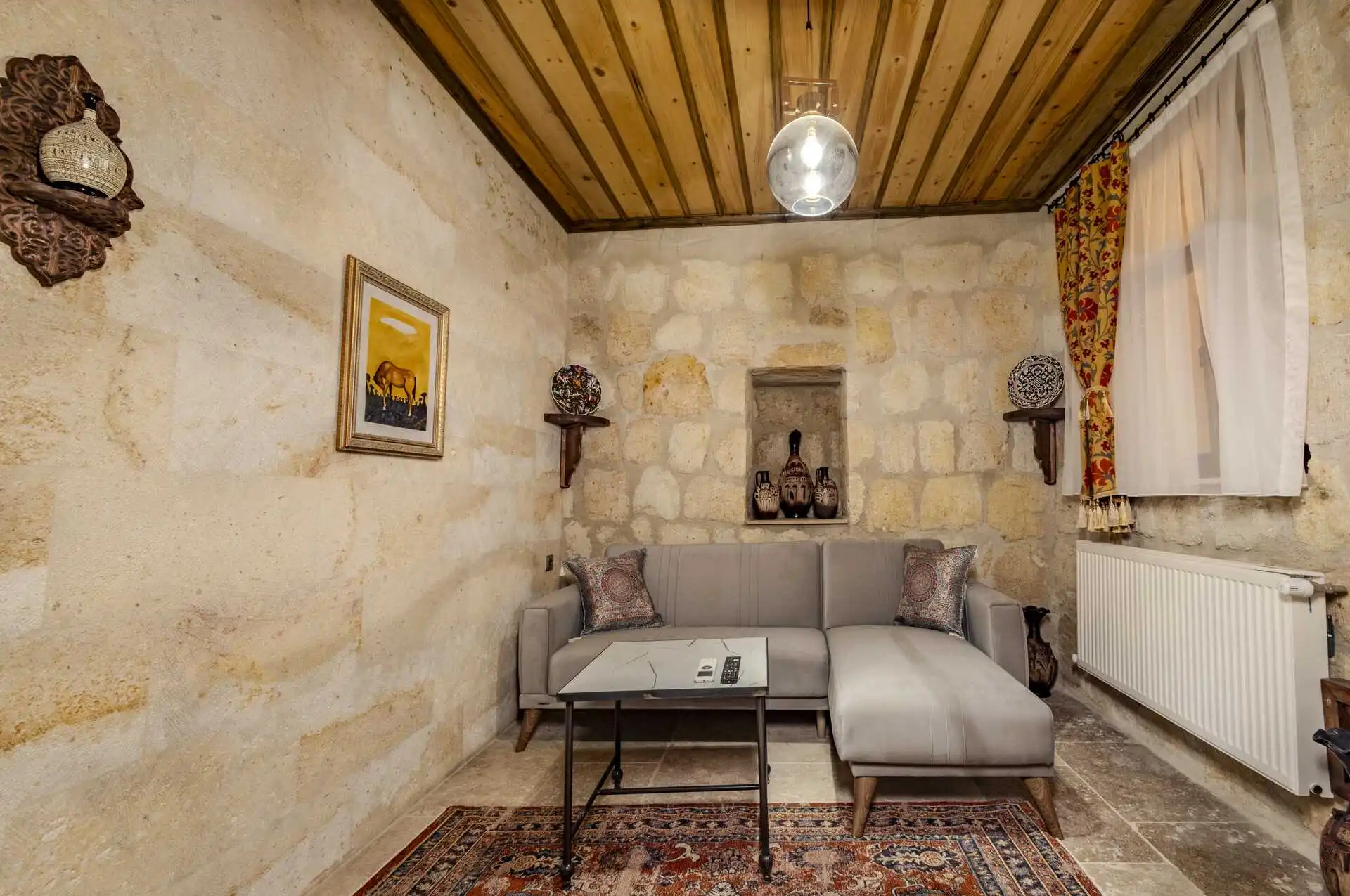 Welcome to room 103, our Deluxe Double King Cave, one of the most special accommodation units at the Sara Cave hotel. This authentic cave room is designed to offer you a unique experience by combining modern comfort with historical texture. As you relax on the spacious and comfortable double bed, you will feel the magic of Cappadocia in every corner of the room.