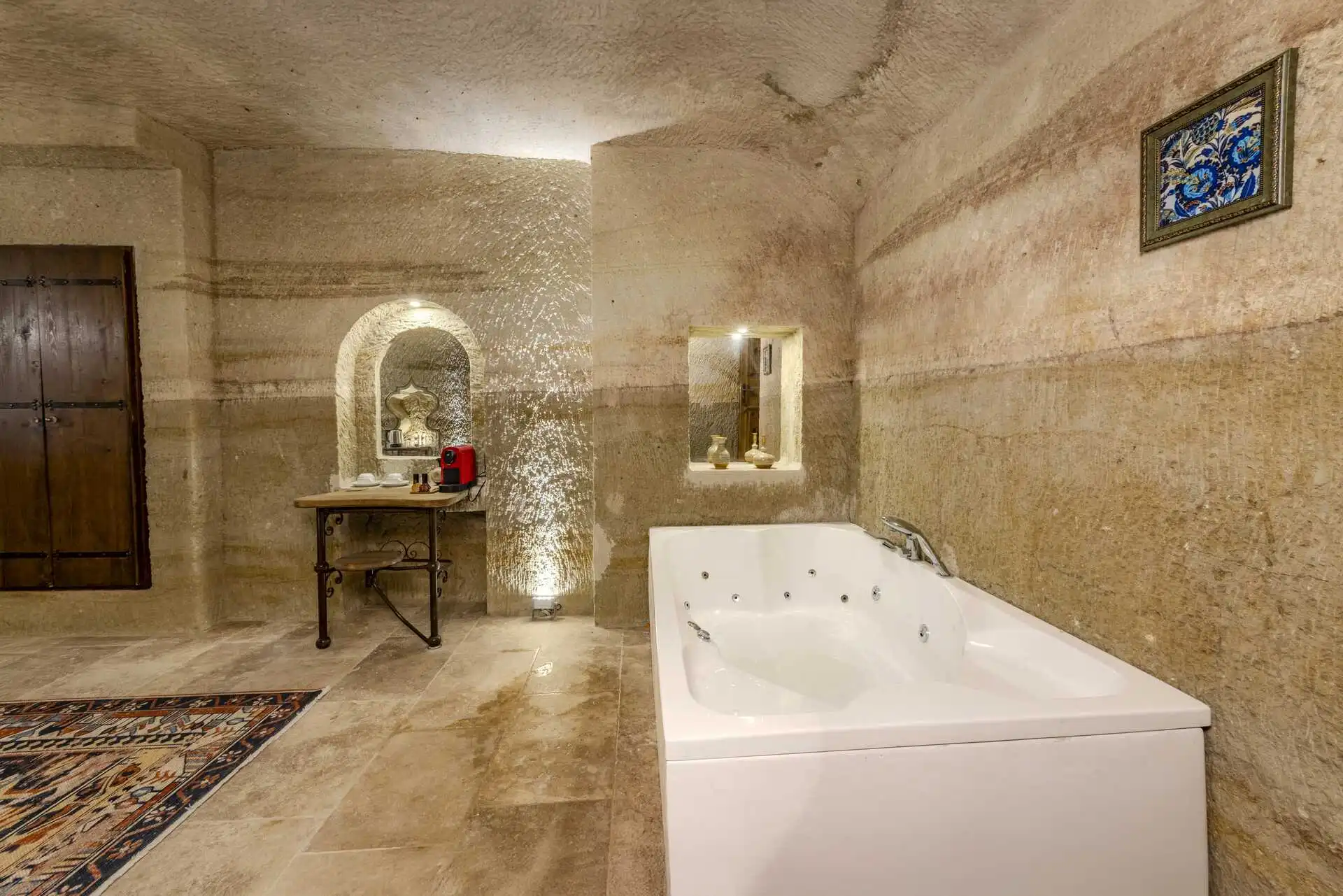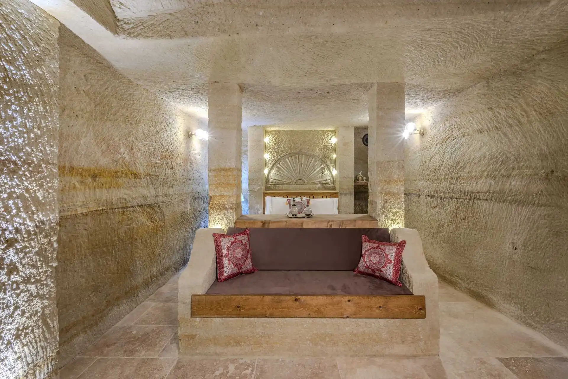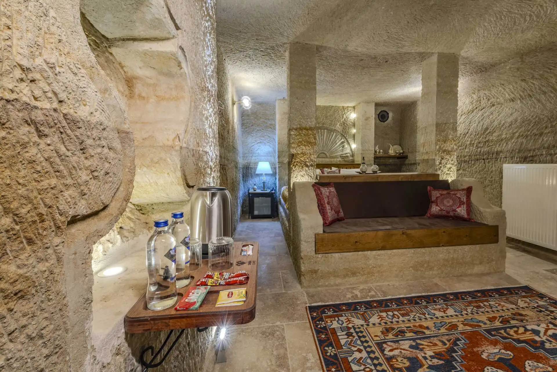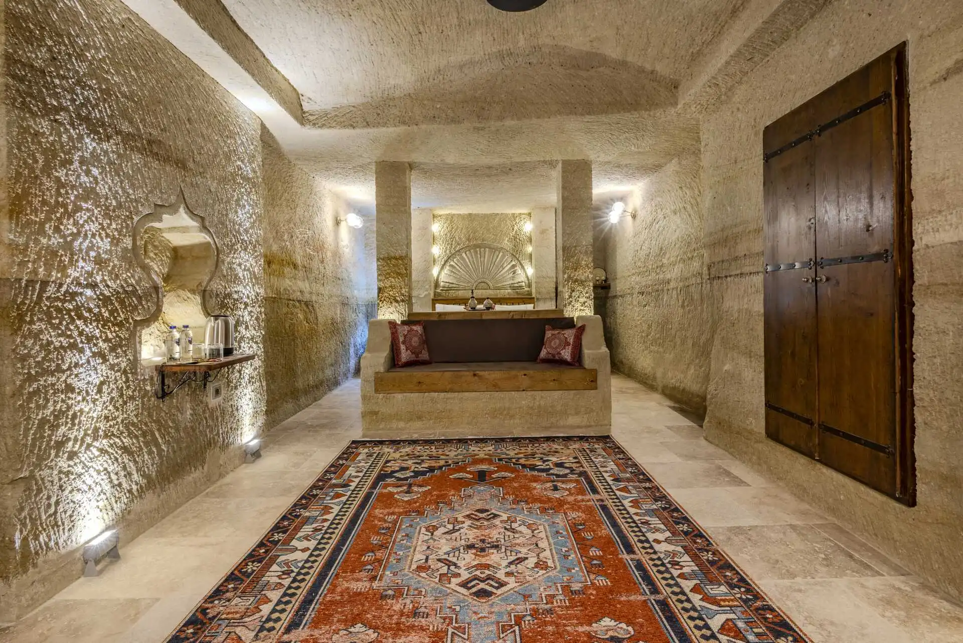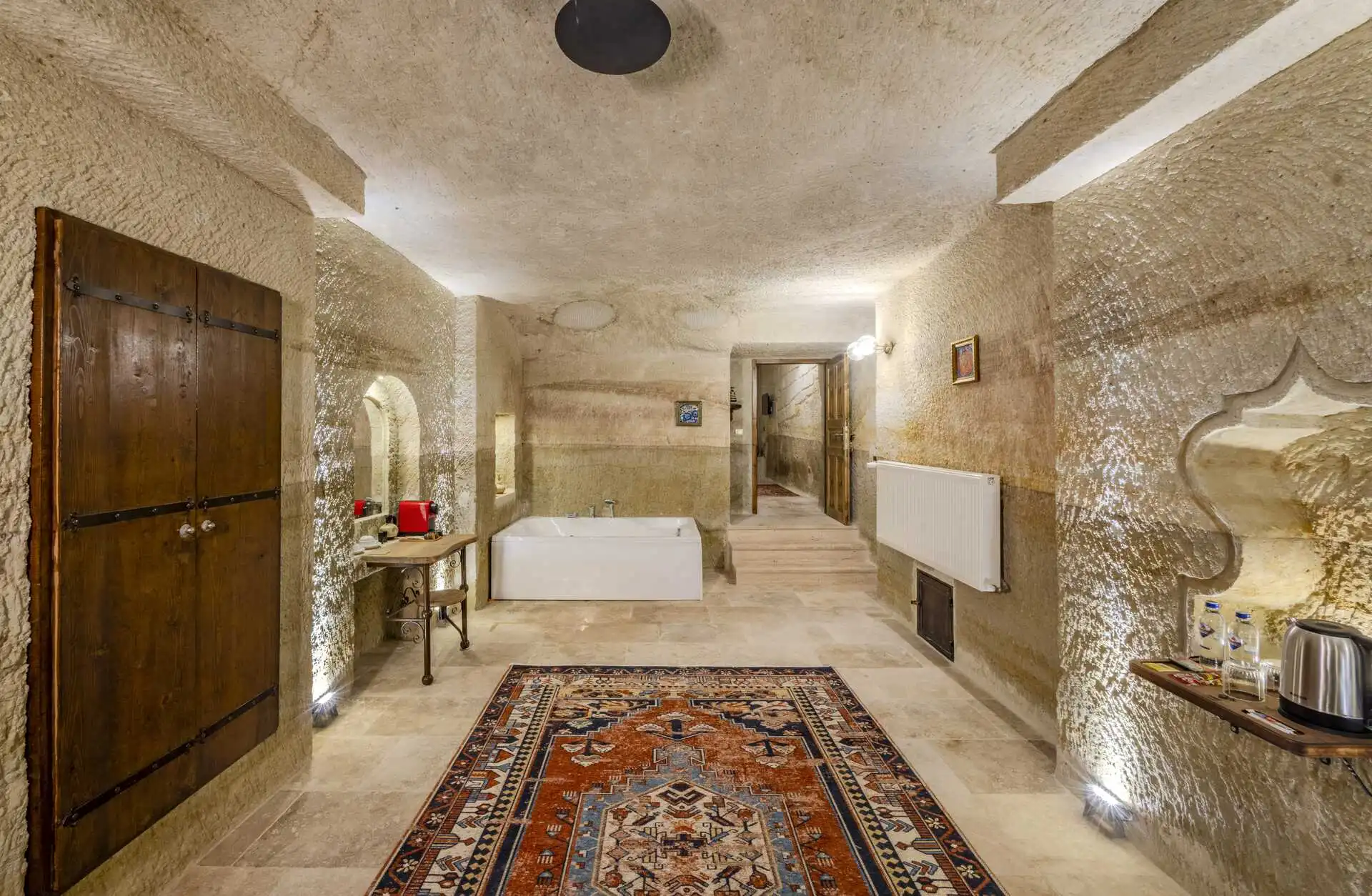 Welcome to room 103, our Deluxe Double King Cave, one of the most special accommodation units at the Sara Cave hotel. This authentic cave room is designed to offer you a unique experience by combining modern comfort with historical texture. As you relax on the spacious and comfortable double bed, you will feel the magic of Cappadocia in every corner of the room.