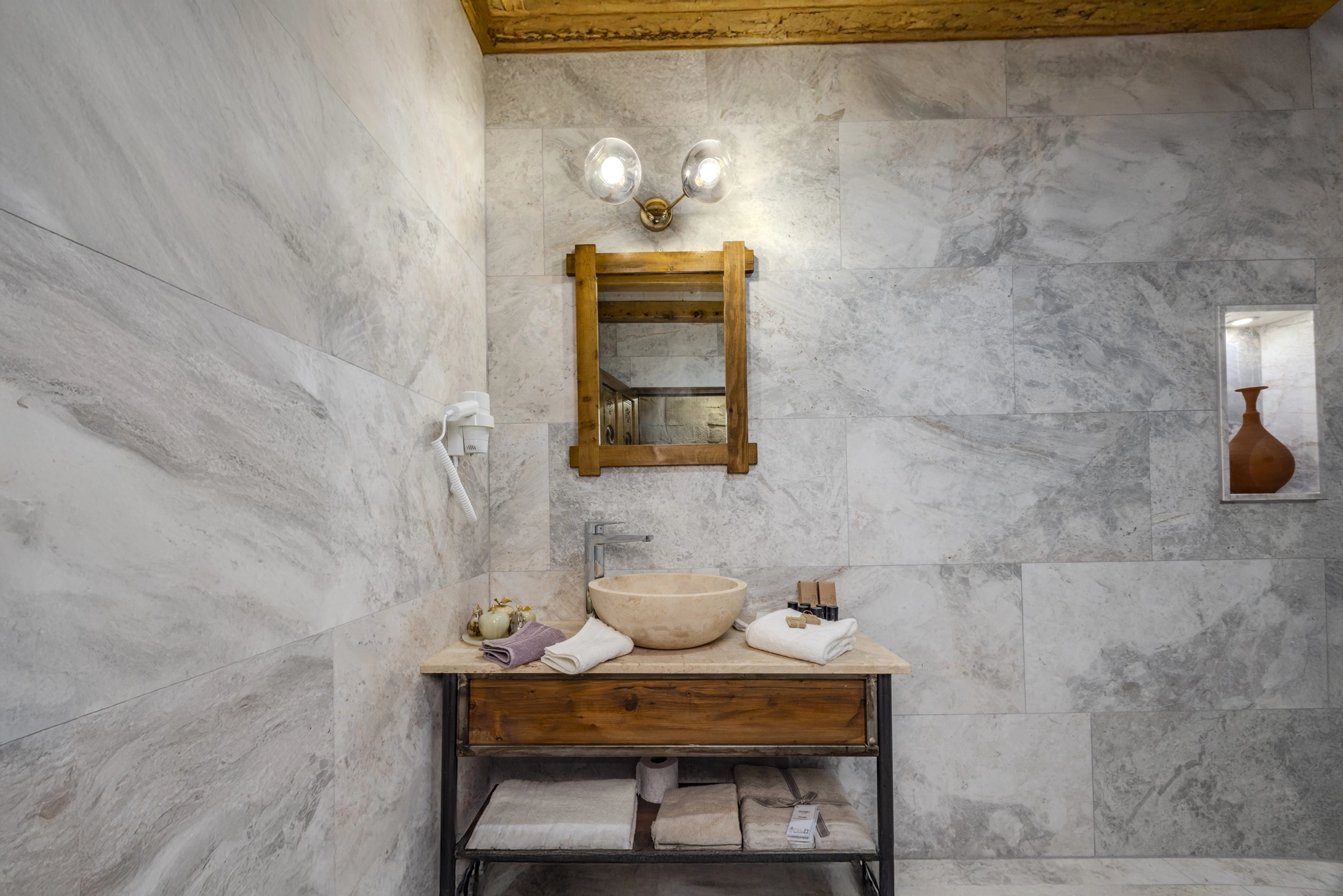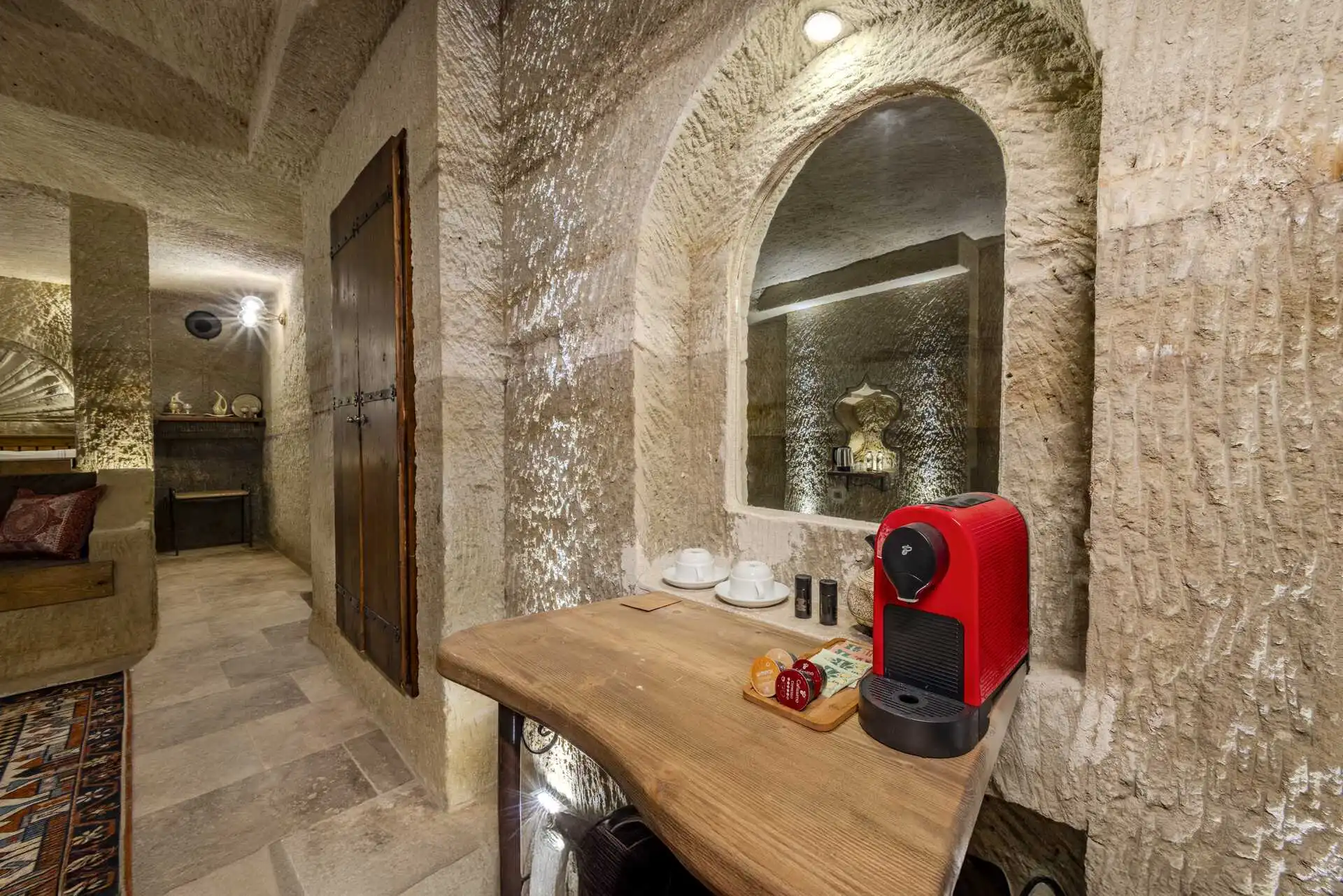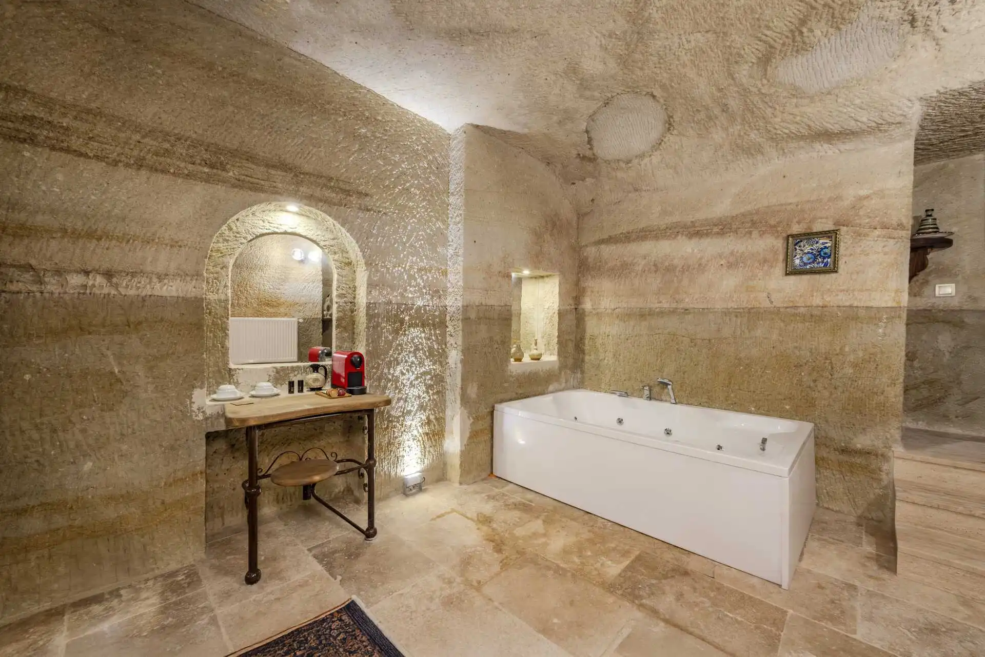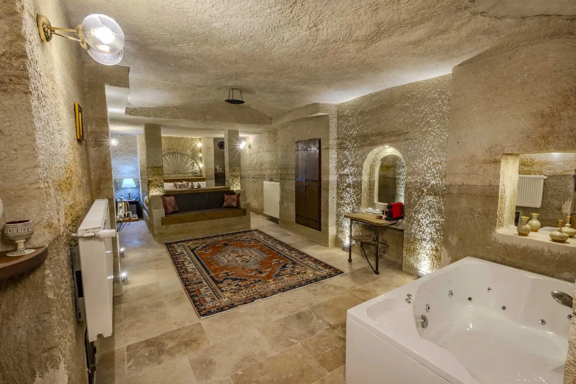 Welcome to room 103, our Deluxe Double King Cave, one of the most special accommodation units at the Sara Cave hotel. This authentic cave room is designed to offer you a unique experience by combining modern comfort with historical texture. As you relax on the spacious and comfortable double bed, you will feel the magic of Cappadocia in every corner of the room.