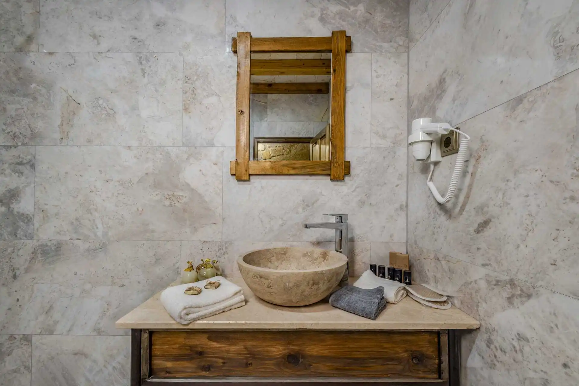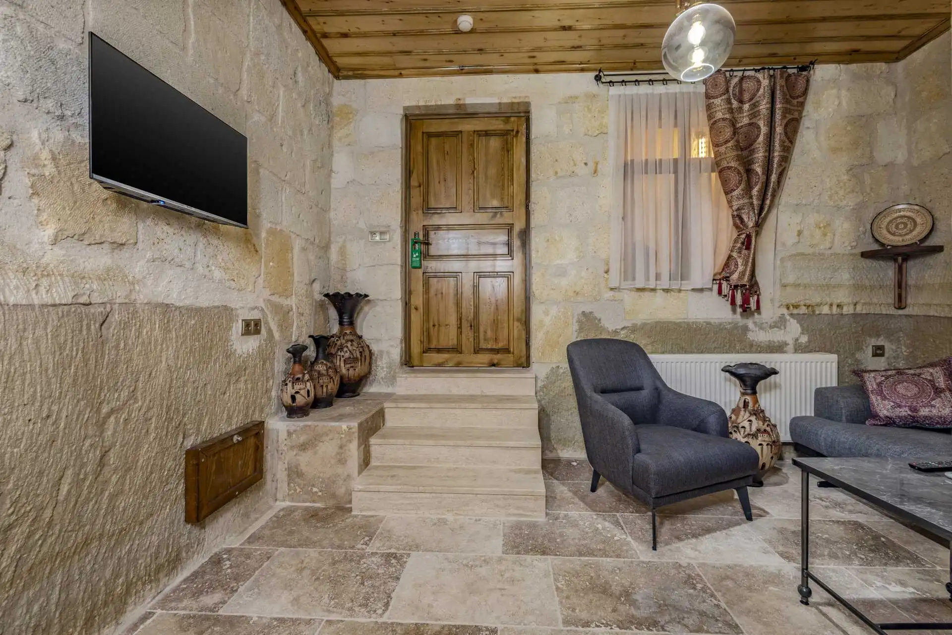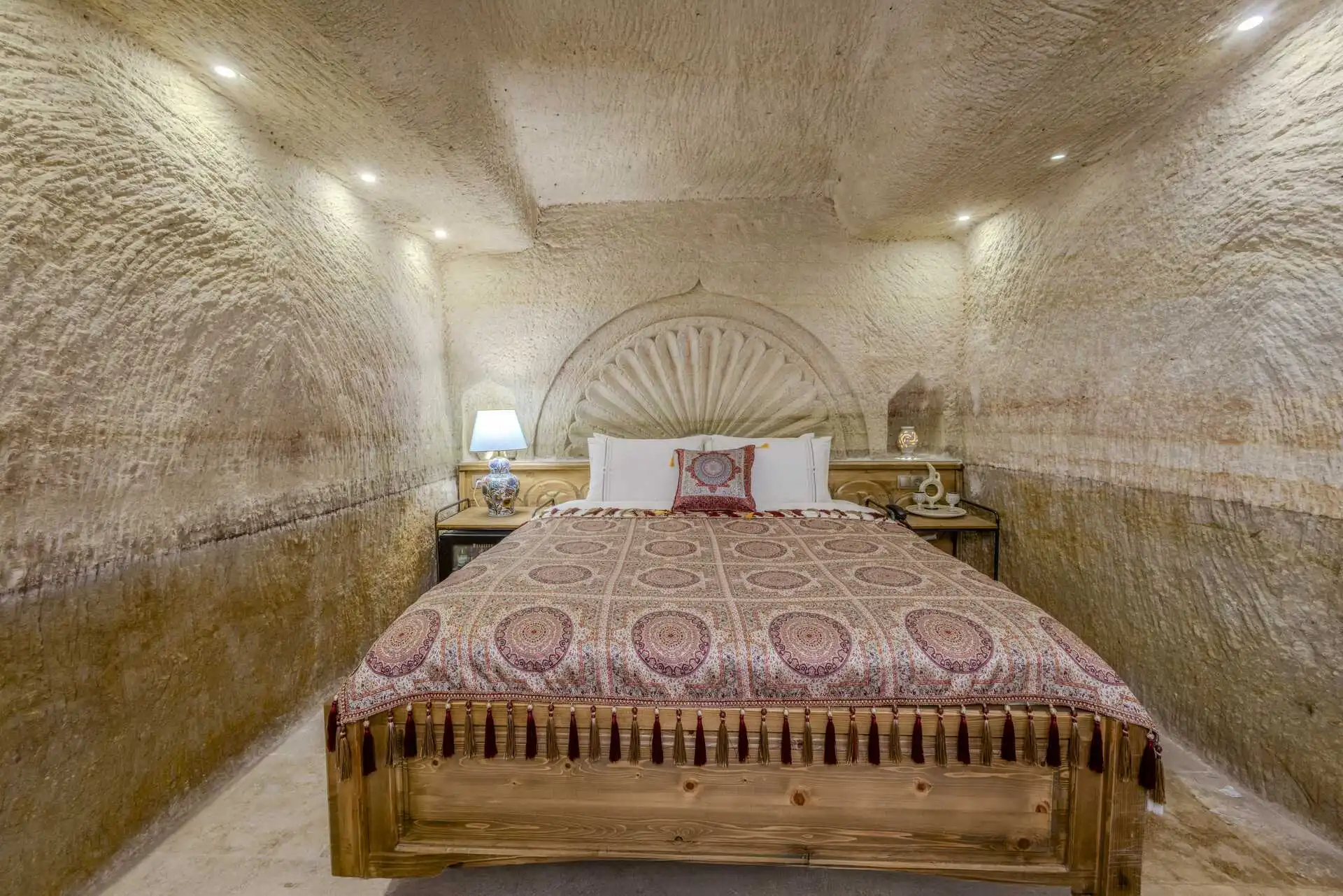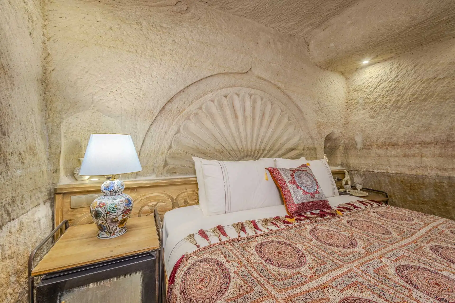 Welcome to room 104, our Deluxe Double King Cave, which elegantly reflects the authentic atmosphere of the Sara Cave hotel. In this special room where historical rock texture meets modern comfort, you can unwind on a spacious and comfortable double bed. Every detail of the room is meticulously designed to provide you with an unforgettable Cappadocia experience.