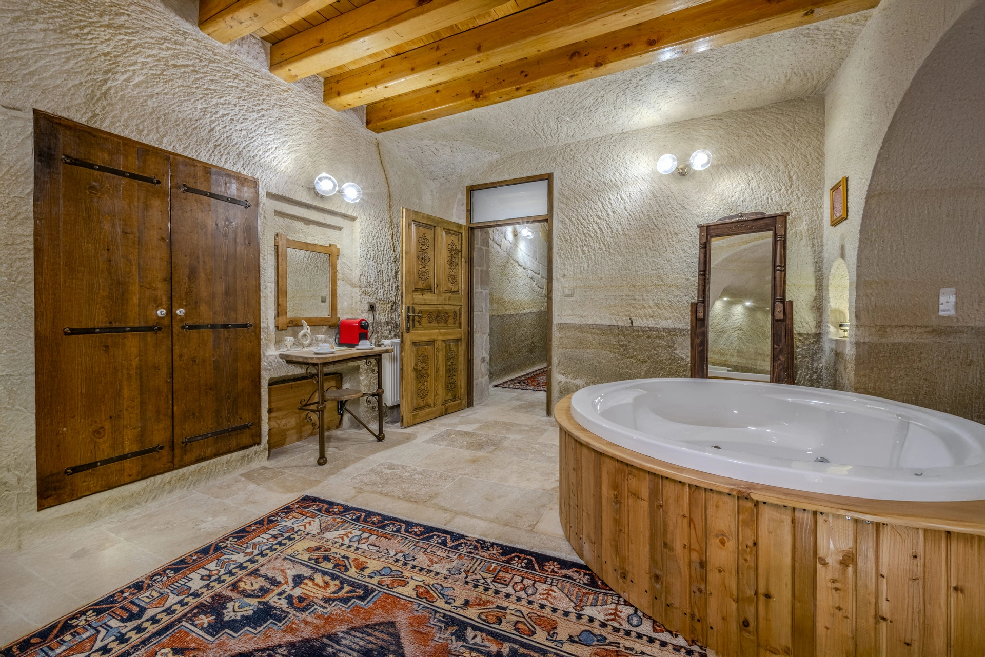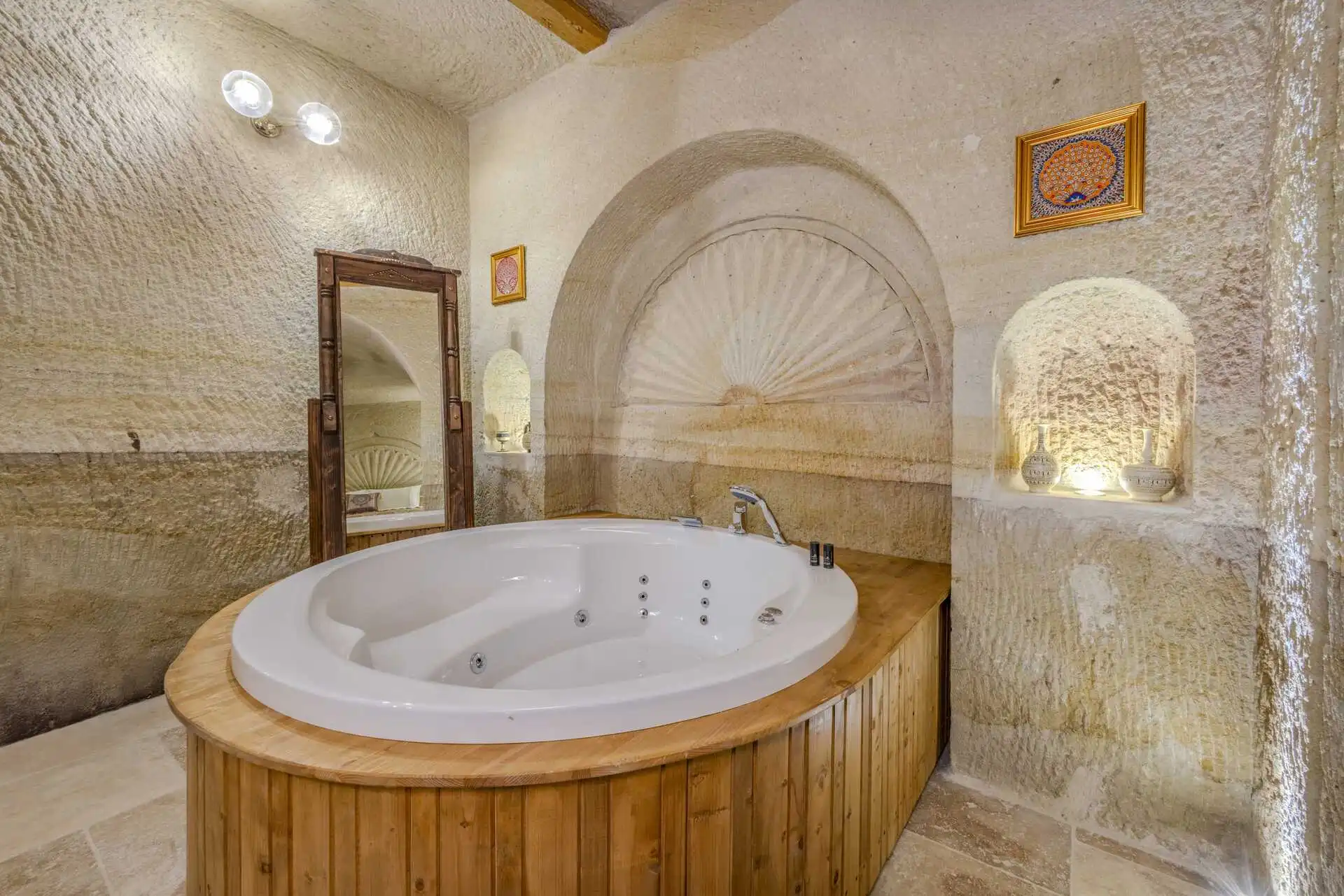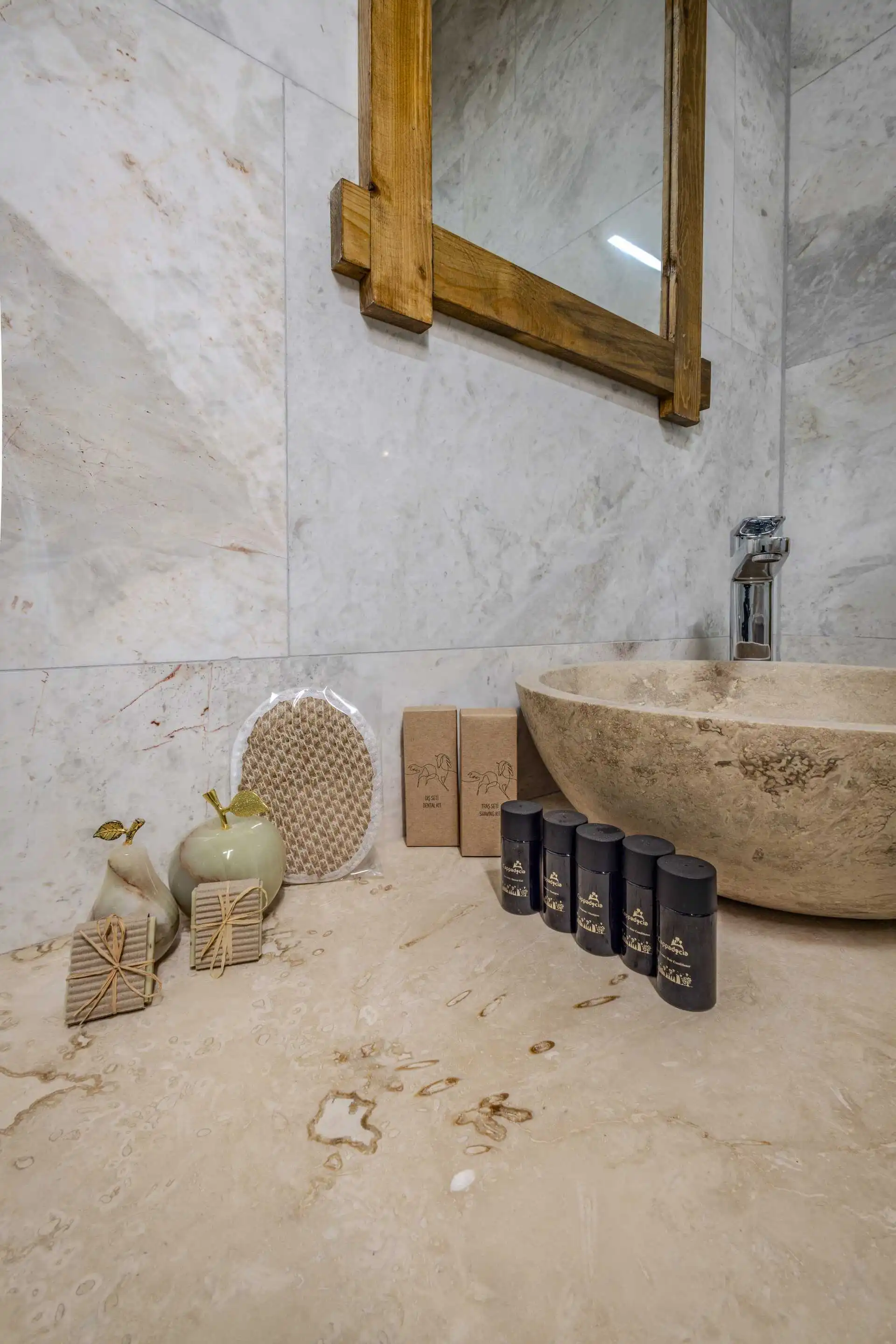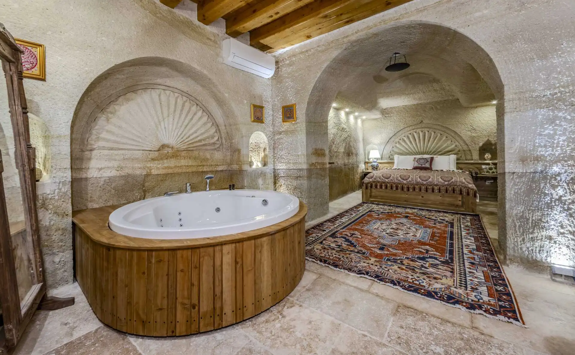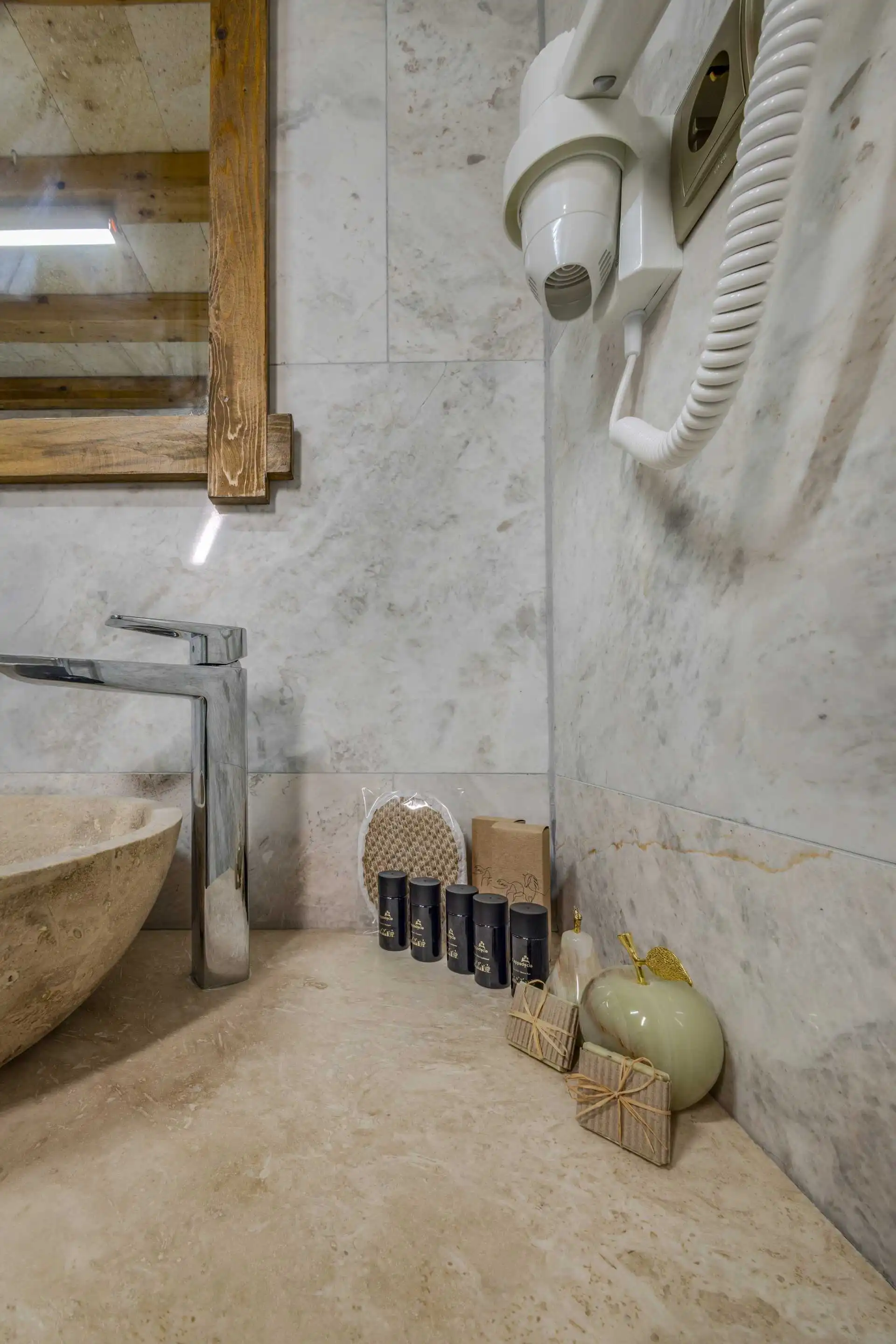 Welcome to room 104, our Deluxe Double King Cave, which elegantly reflects the authentic atmosphere of the Sara Cave hotel. In this special room where historical rock texture meets modern comfort, you can unwind on a spacious and comfortable double bed. Every detail of the room is meticulously designed to provide you with an unforgettable Cappadocia experience.