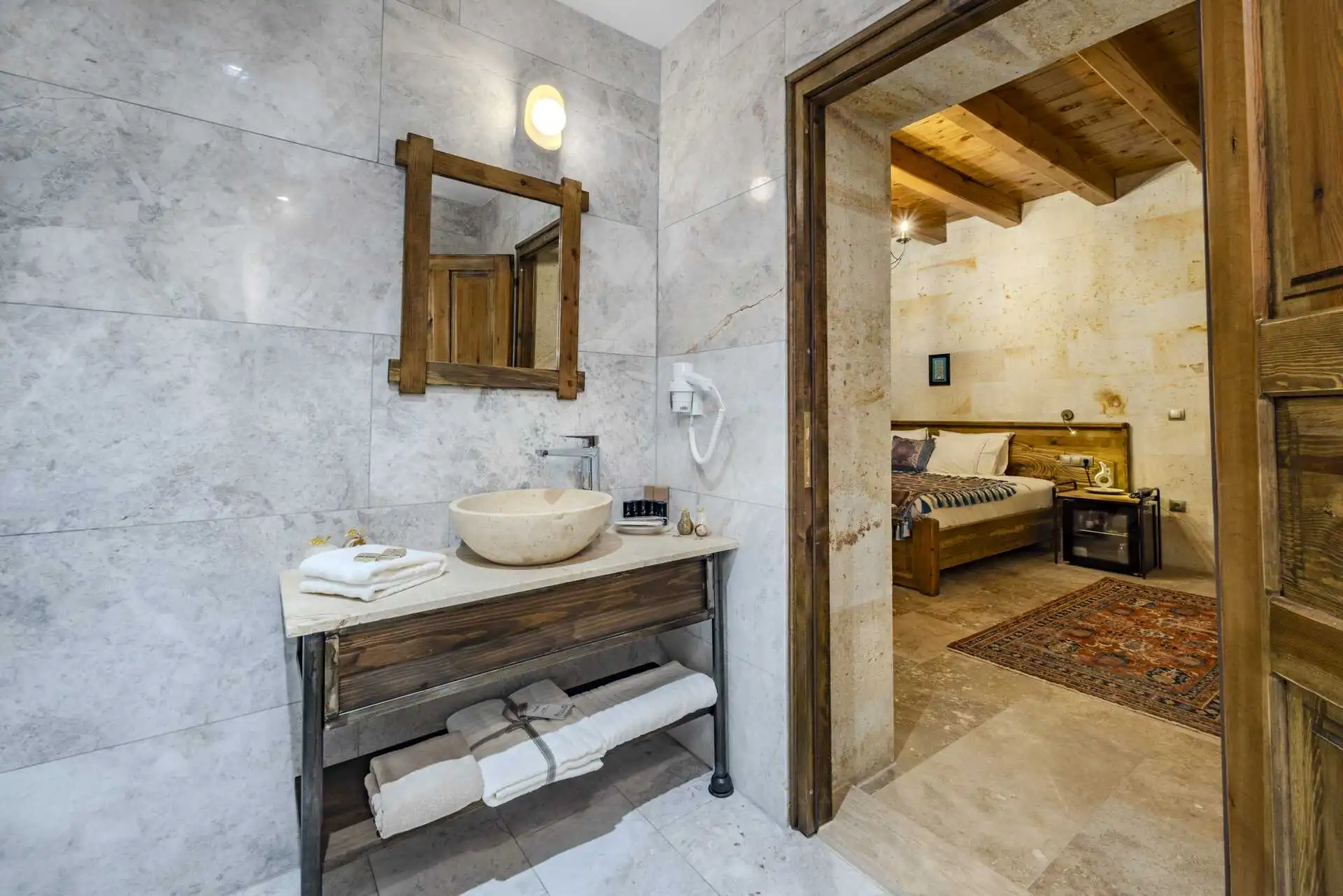 Welcome to room 106, our Deluxe Double King Stone, distinguished by its elegant stonework at the Sara Cave hotel. In this room, where traditional architecture perfectly harmonizes with modern luxury, you will feel part of Cappadocia's authentic atmosphere while relaxing on a comfortable double bed. This room is designed to offer our guests both a relaxing and a privileged accommodation experience.